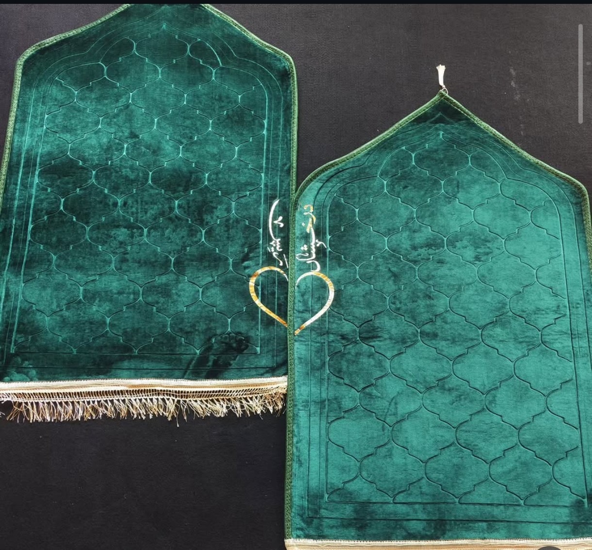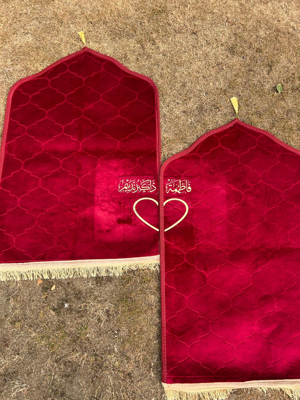 Experience comfort and spirituality with our personalized prayer mat, beautifully crafted with plush velvet and custom embroidery for a truly unique touch.Names with heart on each side of the prayer mats.