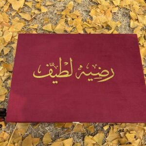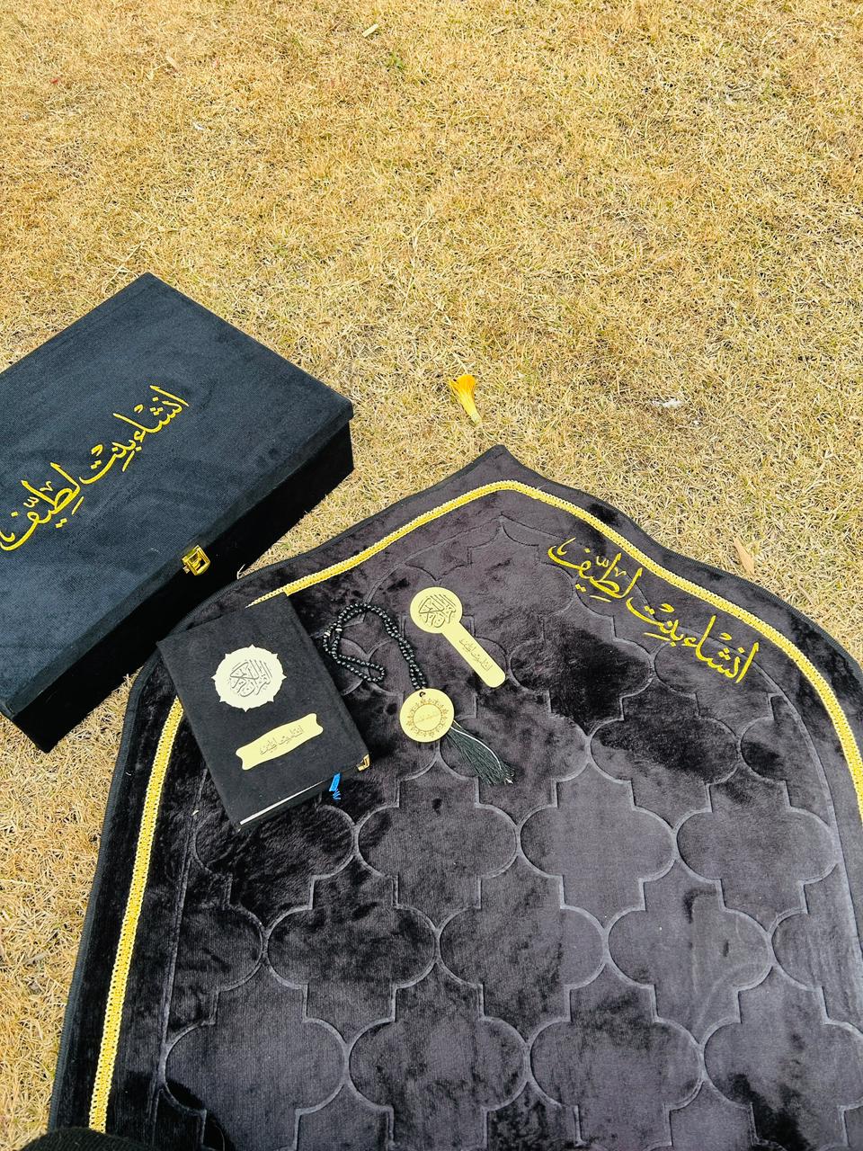 Embroidered Prayer Mat (Janamaz): A plush velvet rug with elegant gold fringe and embroidered details, customized with the recipient’s name (e.g., “Razia Latif”).