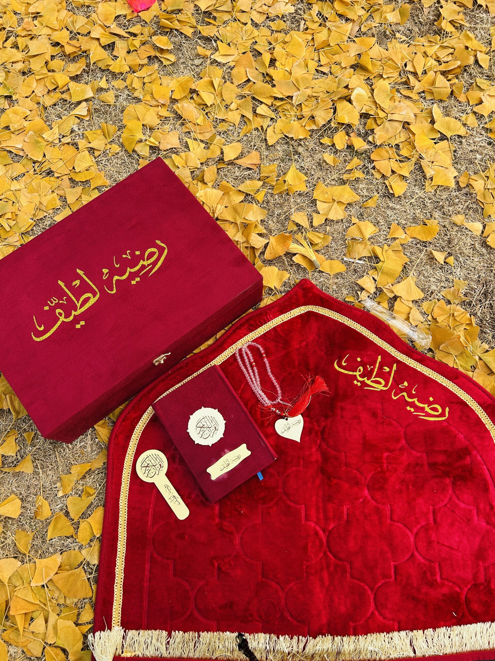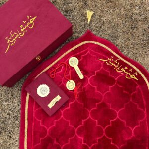 Enrich your daily prayers with the Bloom Basket “Crimson Velvet” Islamic Gift Set. Meticulously designed for beauty and devotion, this coordinated collection is wrapped in rich, deep red velvet and adorned with intricate golden embroidery and custom 3D acrylic calligraphy.
