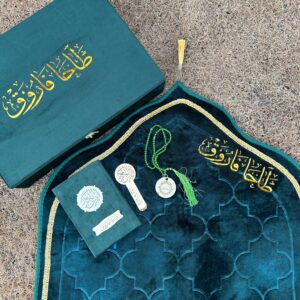 Velvet-Bound Quran: A complete Quran encased in soft velvet, featuring a golden nameplate and “Quran Kareem” calligraphy.