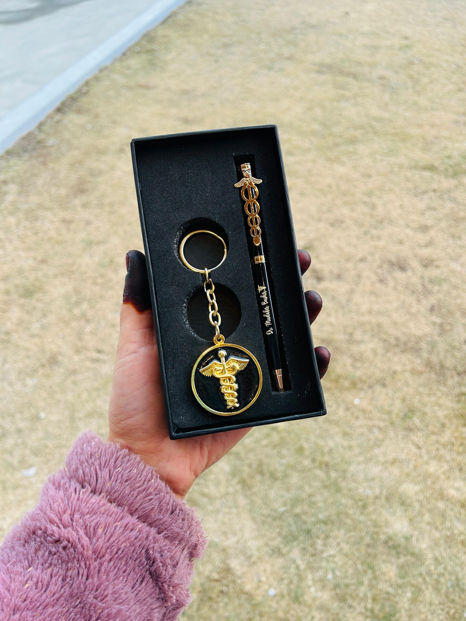 Celebrate the medical professional in your life with this distinguished gift set. Encased in a premium presentation box, the set includes a glossy black pen with gold accents and a matching keychain, both precision-engraved with the recipient’s name and the classic medical Caduceus emblem. It is the perfect token of appreciation for doctors, medical students, or healthcare graduates.