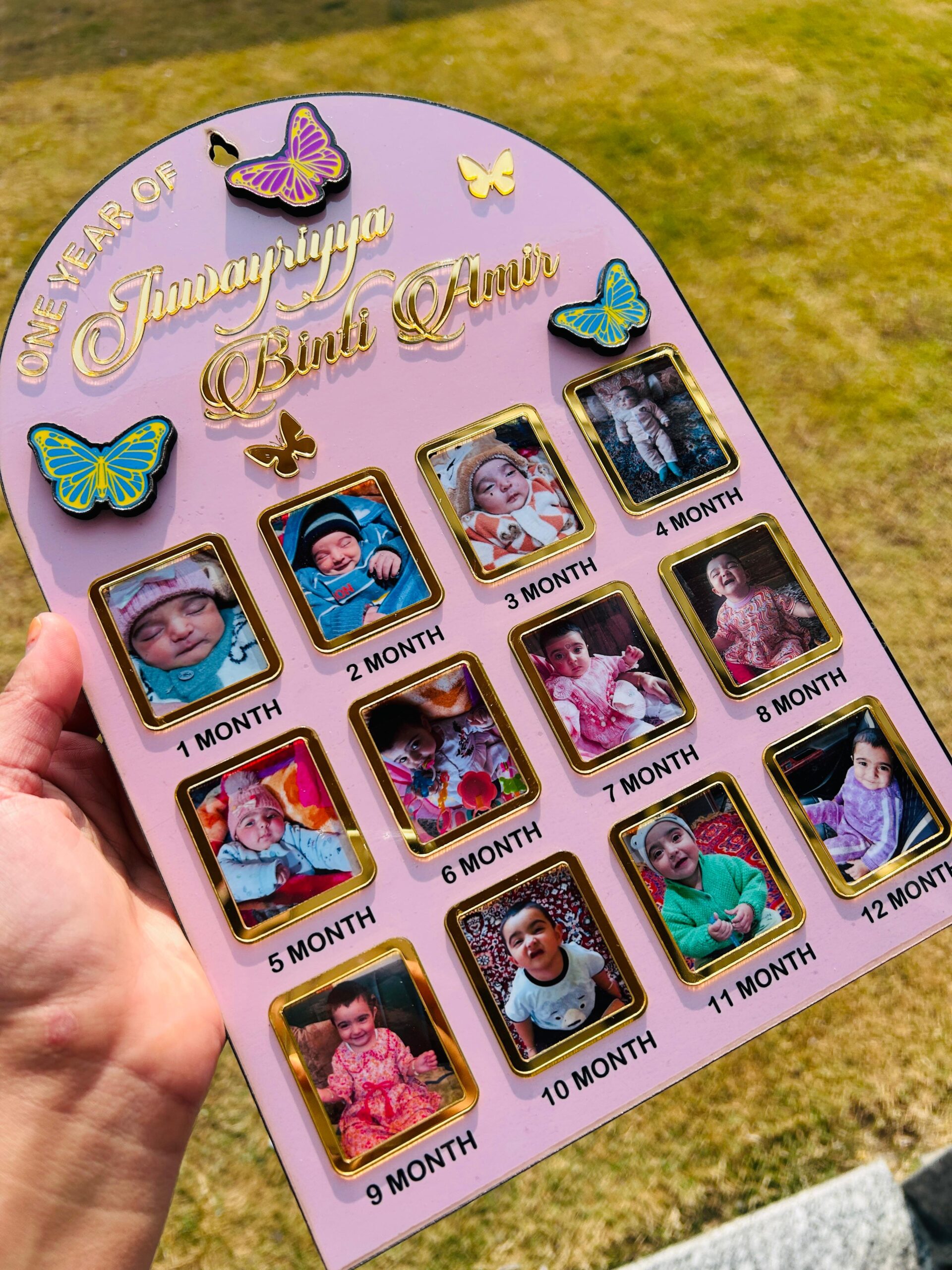 12 Monthly Photo Slots: Dedicated spaces for photos from “1 Month” to “12 Month,” each framed with a golden border to make the pictures pop.