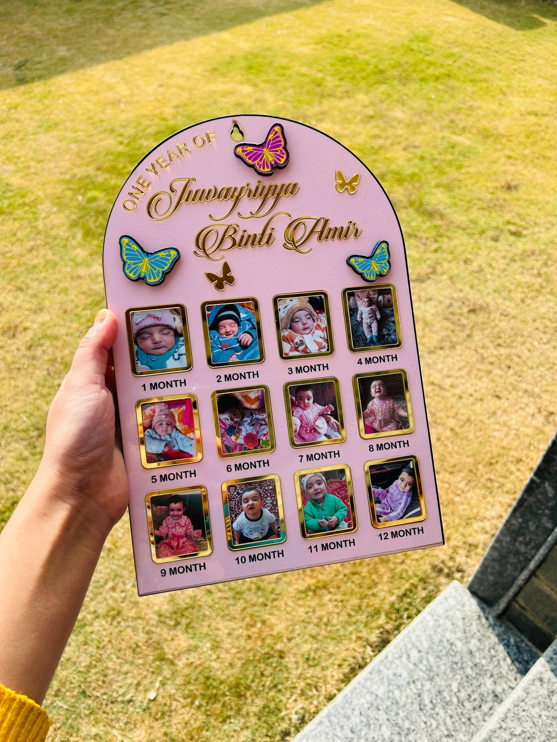 The frame features a soft pastel background (customizable colors available) highlighted by luxurious golden 3D acrylic text and playful butterfly accents. It’s not just a photo frame; it’s a piece of wall art that tells the beautiful story of your child’s growth.