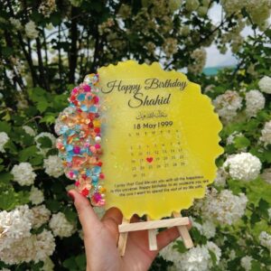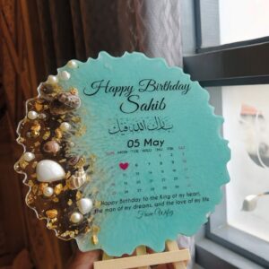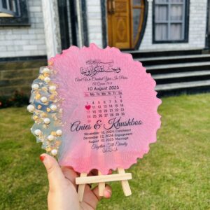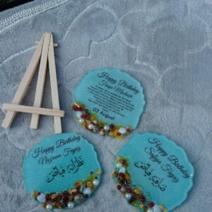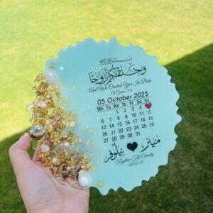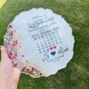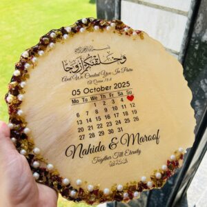 Cherish your milestones forever with our personalized resin calendar coasters, meticulously handcrafted using premium-quality resin and elegant embellishments like pearls, gold leaf, and colored gems for a luxurious touch. Each coaster displays your chosen date highlighted within a miniature calendar, making it an ideal keepsake for wedding, engagement, or anniversary celebrations. Adorned with Quranic verses and heartfelt messages, these coasters symbolize love, togetherness, and a blessed union. Designed to be both decorative and practical, they make memorable gifts for loved ones and beautiful table accents that capture meaningful memories.