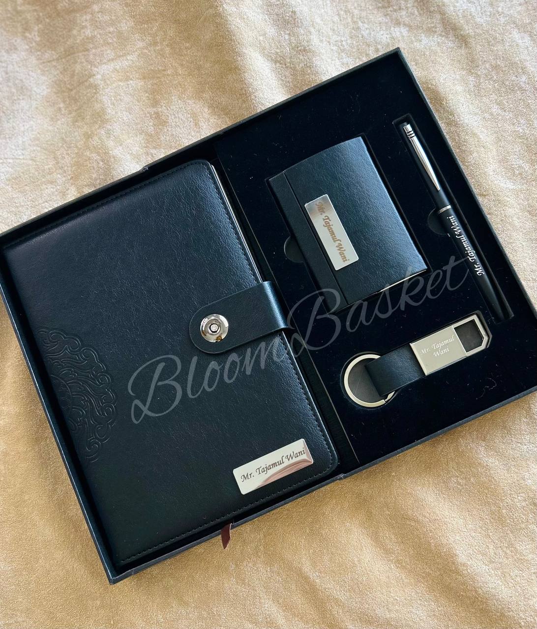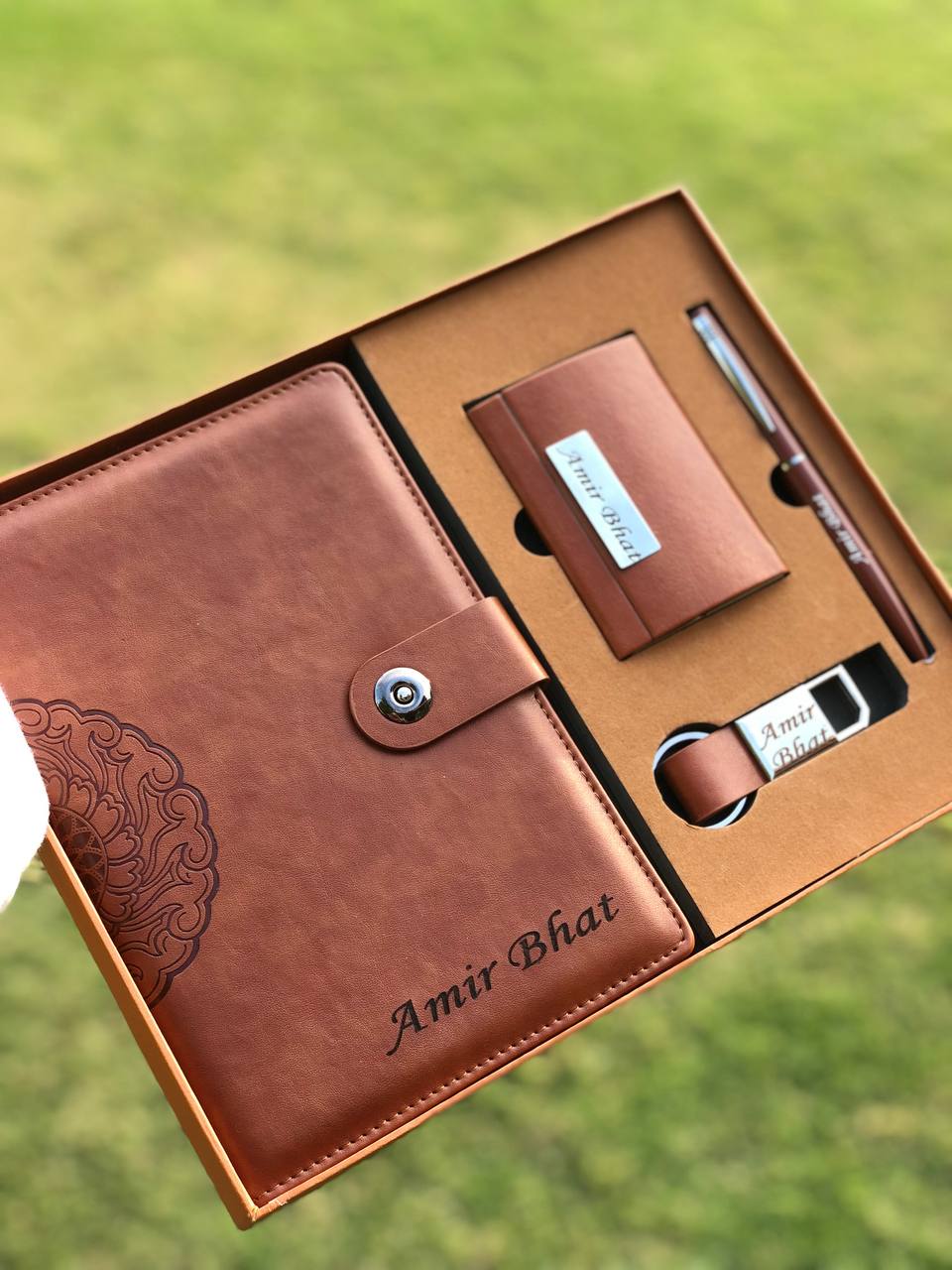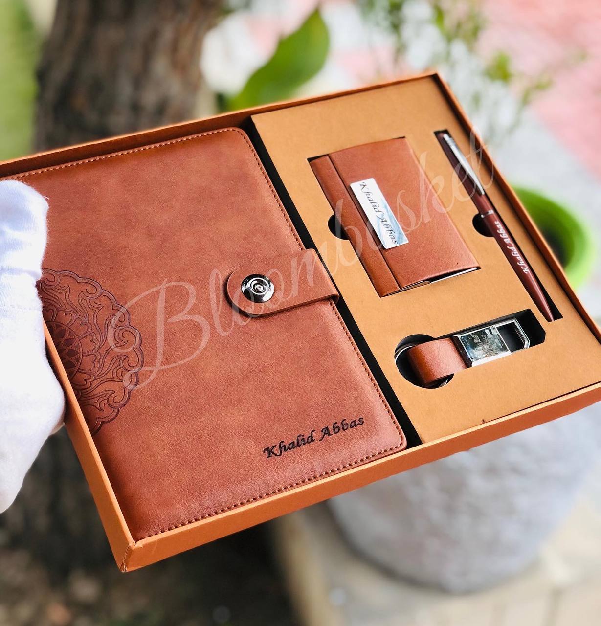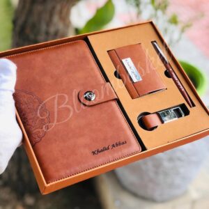 A5 Premium Diary: A high-quality hardbound notebook with a soft-touch leather cover, button closure, and intricate mandala embossing on the spine. Personalized with the recipient’s name (e.g., “Khalid Abbas”) on the cover.