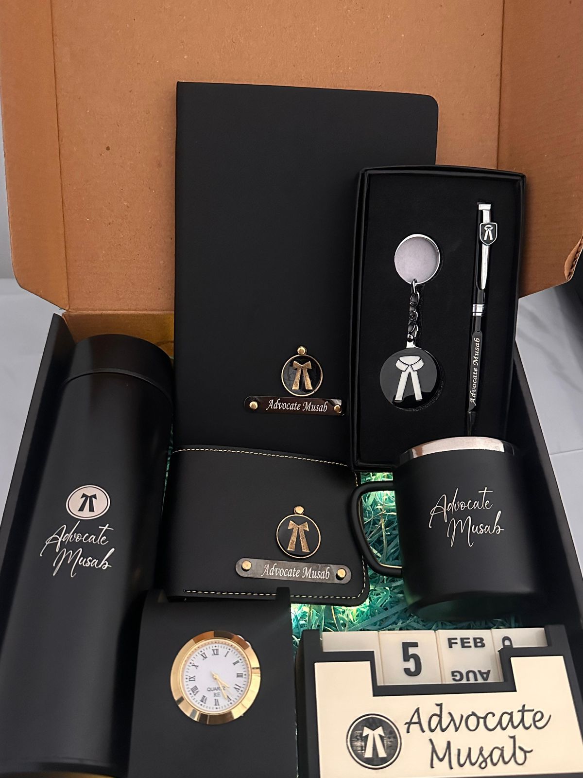 “Honor their profession with the ‘Legal Professional’ Customized Gift Hamper. Designed specifically for lawyers and advocates, this 7-piece premium black collection exudes authority and elegance. Every item in this set is personalized with their name (e.g., ‘Advocate Musab’) and the iconic Advocate ‘band’ logo in gold.