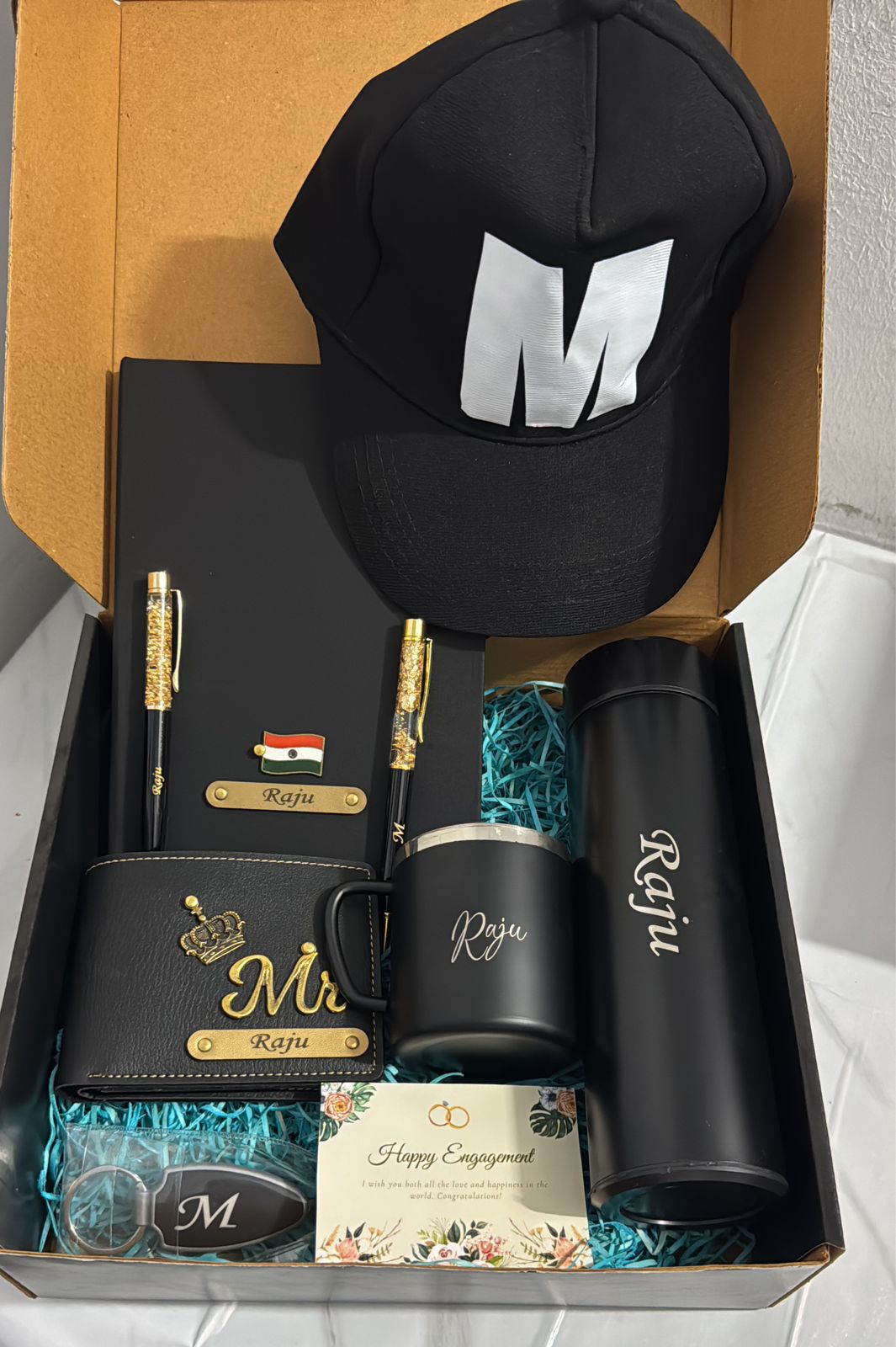 “Make a bold impression with this ‘Signature Black’ customized hamper. Packed with a personalized cap, diary, temperature bottle, mug, wallet, keychain, and two luxury gold-flake pens, this set is the ultimate all-in-one gift for him. Perfect for engagements, birthdays, or special milestones.”