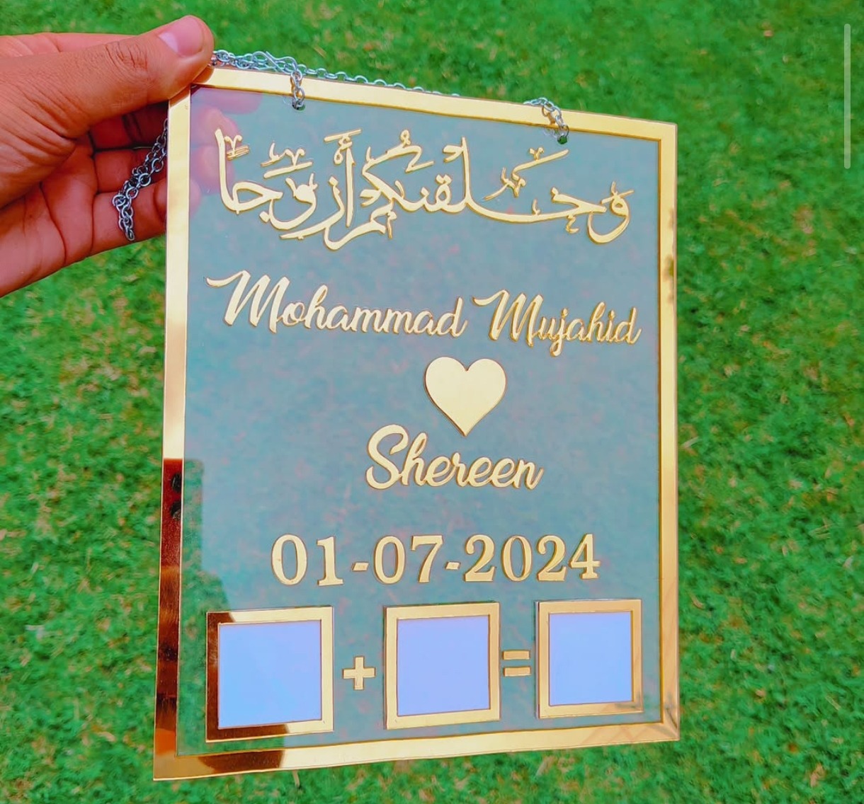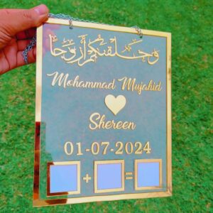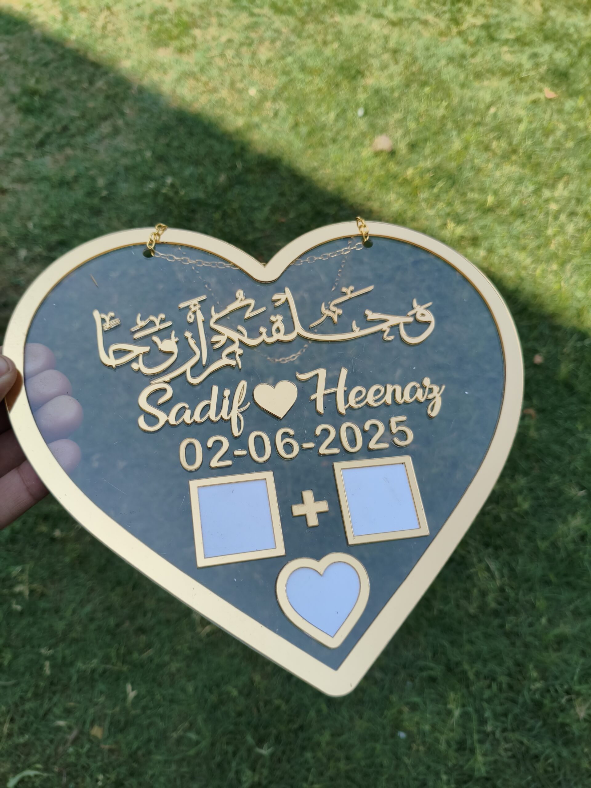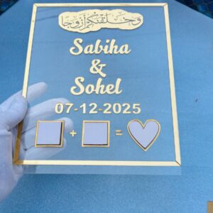Mark your Nikah or engagement with our personalized thumbprint plaque, thoughtfully designed to showcase the couple’s names, wedding date, and stylish motifs. Each frame includes dedicated spaces for bride and groom thumbprints, symbolizing unity and love in a creative and meaningful way. Available in classic and heart shapes, these elegant frames are perfect for ceremonies and serve as lasting keepsakes to display at home. Made with premium materials and customizable to match your event theme, the thumbprint keepsake offers a heartfelt touch for weddings, anniversaries, or gifts, ensuring your memorable day is uniquely celebrated.