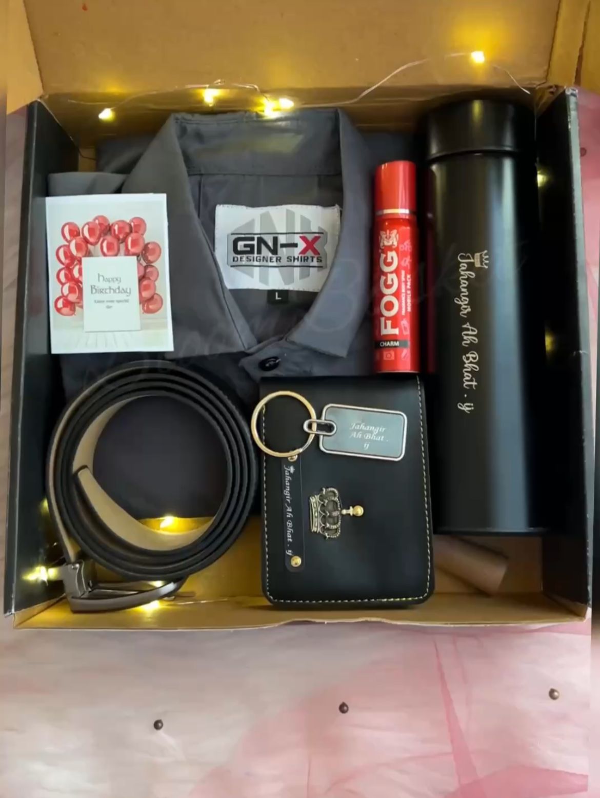 “Give the gift of complete style with our Ultimate Men’s Gift Combo. This thoughtfully curated box includes everything a modern man needs: a high-quality formal shirt, a customized temperature bottle with his name, a sleek leather wallet, a durable belt, and a matching keychain. We’ve even included a Fogg body spray and a ‘Happy Birthday’ card to make the celebration complete. Whether it’s for a husband, father, or brother, this personalized set is designed to impress.”